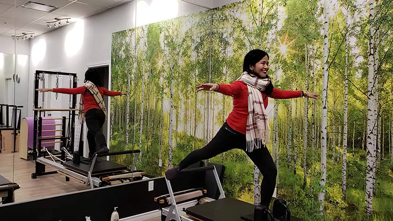 Πιστοποιημένη Εκπαιδεύτρια STOTT PILATES κάνει Pilates στο Merrithew V2 Max Plus Reformer σε ένα Pilates studio στις Φιλιππίνες