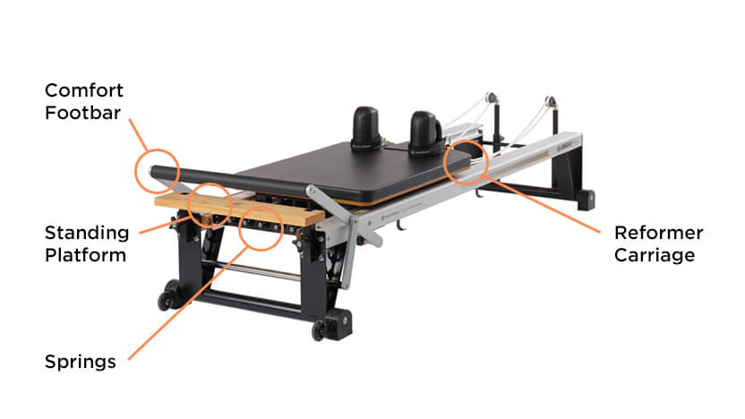 Στο διάγραμμα φαίνονται κάποια από τα βασικά στοιχεία ενός Pilates Reformer, συμπεριλαμβανομένων των Comfort Footbar, Standing Platform, Ελατηρίων και Reformer Carriage.
