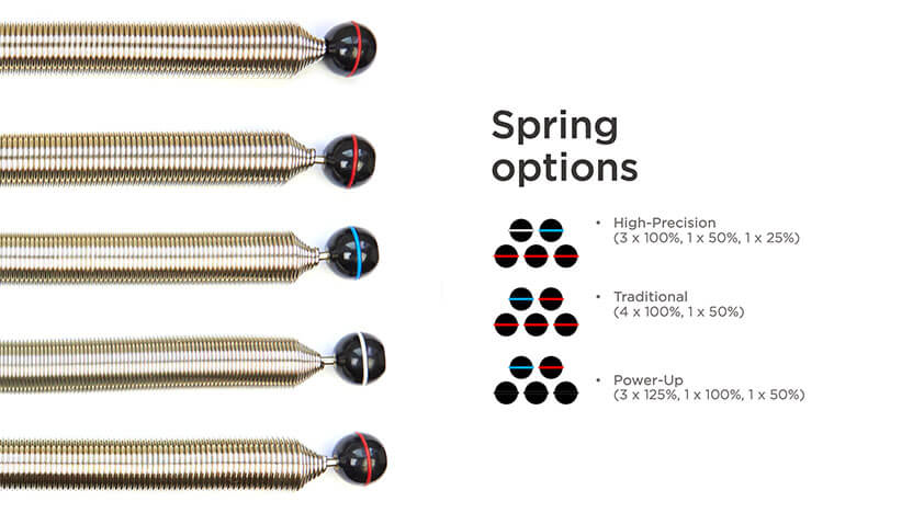 Τα ειδικά κατασκευασμένα ελατήρια της Merrithew είναι επινικελωμένα και έχουν υποστεί θερμική επεξεργασία, όντας εξαιρετικά ασφαλή και ανθεκτικά. Διατίθενται με μια μοναδική μπάλα ελατηρίου που τα συνδέει με ασφάλεια με το κιβώτιο ταχυτήτων.