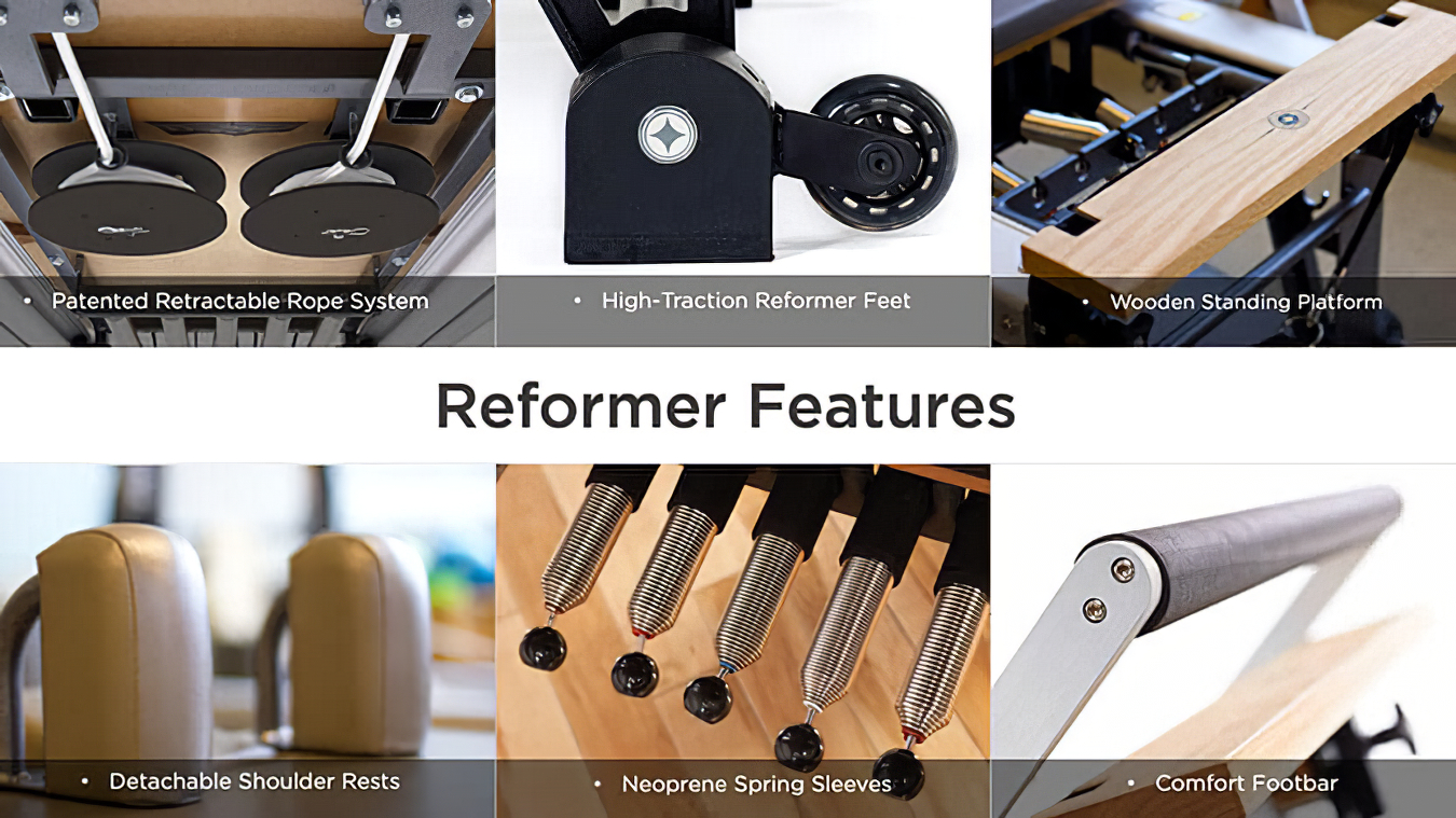 Μερικά από τα βασικά χαρακτηριστικά των Reformers της Merrithew περιλαμβάνουν: το Πατενταρισμένο Ανασυρόμενο Σύστημα Σχοινιών, το High-Traction Reformer Feet, την Ξύλινη Όρθια Πλατφόρμα, τα Αποσπώμενα Στηρίγματα Ώμων, την Επένδυση των Ελατηρίων από Νεοπρένιο και την Comfort Footbar.